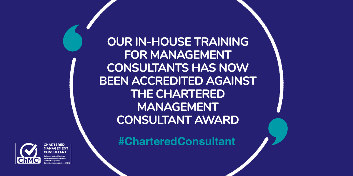 The ChMC accreditation, delivered by the Chartered Management Institute (CMI) and the Management Consultancies Association (MCA), is the leading professional benchmark for management consultants. Our re-accreditation confirms that our training and development programme continues to meet the rigorous standards of the ChMC Competency Framework, offering our consultants a structured pathway to Chartered status and giving clients confidence in the quality and integrity of our work.